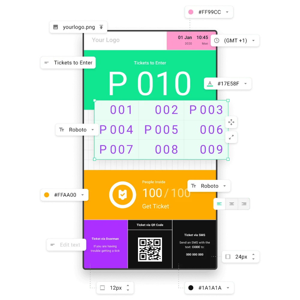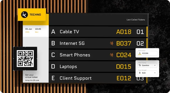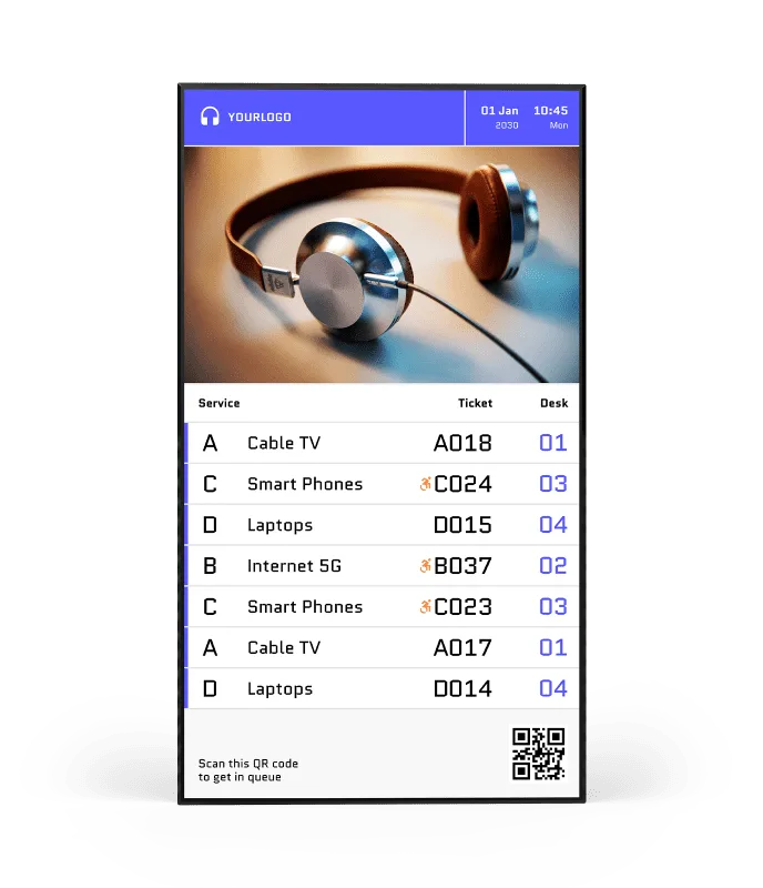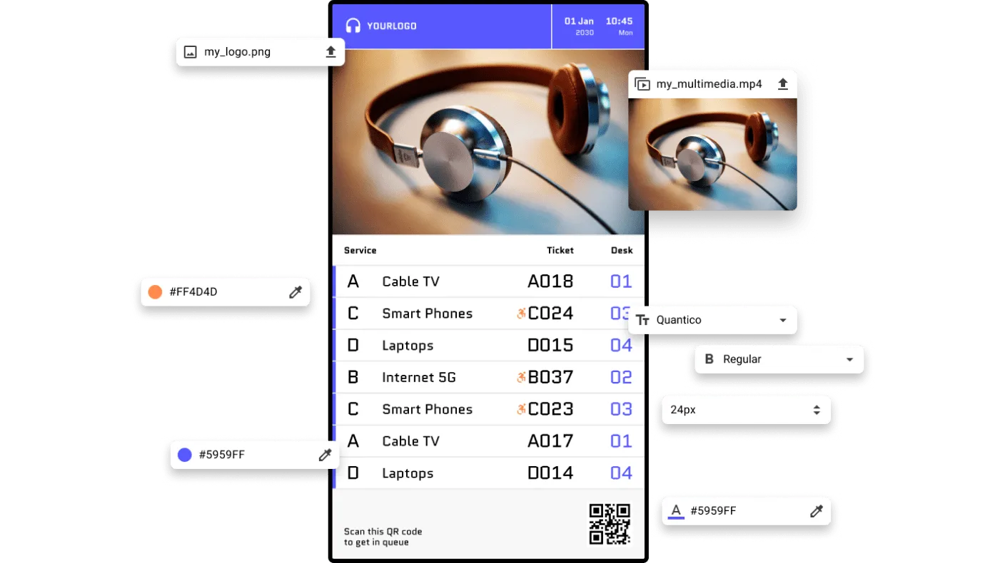 Display the queue status, ticket numbers, services, multimedia playlists and more